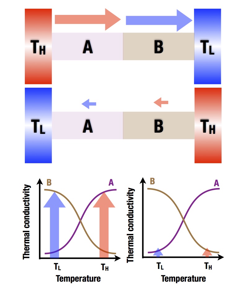 2006年に,熱伝導度の温度依存性の異なる2つの材料を組み合わせることで熱整流効果が得られることが理論的に指摘されました.提案された機構を用いて熱整流効果を大きくするためには,熱伝導度に顕著な温度依存性を示す材料を利用する必要がありますが,一般的な固体材料では室温以上の温度領域で熱伝導度の温度依存性は顕著ではなく,この機構を用いた熱整流材料の開発は格子熱伝導度の温度依存性が顕著になる200K以下に限られていました.熱整流材料の利用による省エネルギー化の実現のために,室温以上で熱伝導度が顕著に変化する材料の開発と,それを利用した高性能熱整流材料は開発が強く望まれています.