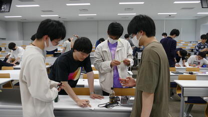 河野教授からは、手を動かし、アイデアを可視化しながら頭を働かせることの重要性が説かれました。一連の講義・演習を通して、学生たちは「課題発見→解決策の提案」のプロセスを体感した様子でした。課題を発見し、意見を出し合いながら解決策を模索し、アイデアを論理的に形にしていく手順は、本学の学生の本分である工学の学習・研究にもつながるものだと言えます。