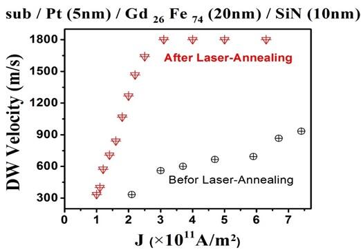 DX推進には、革新的な高速省電力メモリの創成が求められている。この解決策として磁性細線メモリへの期待が高い。しかし、データの高速転送にはデータである磁壁の移動速度の高速化が求められている。そこで、この解決策として細線へのレーザーアニール効果を提案した。右図には、細線へのレーザーアニール有無での磁壁移動速度の差異を示した。レーザーアニールを施さない駆動電流密度(J)が3x1011A/m2のときの磁壁移動速度は600m/secなのに対し、レーザーアニールを施した場合の磁壁移動速度は1800m/secに改善することができた。1ビット長100nmのとき、データ転送レートは18Gbpsとなり、DXのデータ転送高速化要求に応えることができる。また、レーザーアニール前には駆動電流密度に比例して磁壁移動速度が増加しているが、実用化の際には、駆動電流密度が変動しても速度は一定であることが必要である。しかし、レーザーアニールの結果を見てみると、Jが3x1011A/m2以上で壁移動速度は一定になっているので、この点でも理想的な結果を得ることができた。