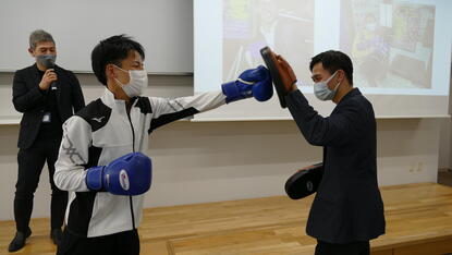 講演の後は、参加者全員でボクシングの体験を行い、聴講した新入生・教職員にとって大いに刺激となる講演会となりました。嶋田さん、ありがとうございました!