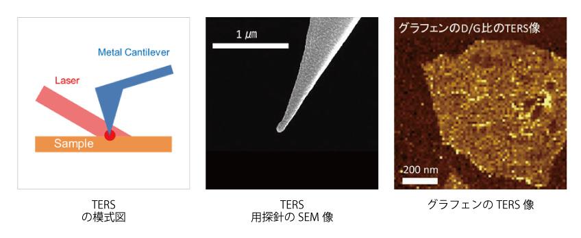 AuやAgなどの金属薄膜で被覆した原子間力顕微鏡(AFM)のカンチレバー先端にレーザー光を照射すると、探針先端において局所表面プラズモンが励起されて極局的に強い電場が発生する。この電場により、探針先端近傍のナノスケールサイズの領域から増強されたラマン散乱光が発生する。これを探針増強ラマン散乱(TERS)と呼ぶ。TERSにより、光の回折限界をこえたナノスケールでのラマン分光測定が可能となる。グラフェンやカーボンナノチューブなどに代表されるナノ材料は、欠陥のサイズや分布、種類などによってその特性が大きく変化することが知られており、特性の制御やデバイス開発には欠陥のナノオーダーでの評価が重要となる。本研究室では、TERSのさらなる高感度化および測定の再現性向上を目指し、TERS用探針および測定法の開発を進める。