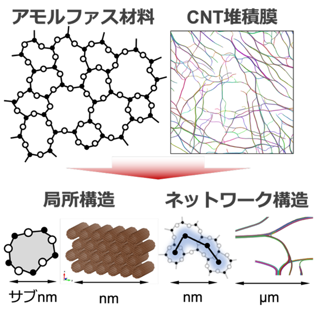 アモルファス材料やナノ材料集積体などの無秩序構造における熱輸送は、サブnm~nmサイズの局所構造と、それらの連結によって形成されるnm~μmスケールのネットワークに強く相関していることが知られています(図2)。従来の「均等に乱れた格子モデル」に基づく熱伝導理論では、実材料に存在する局所構造の秩序やネットワークを十分に考慮できておらず、局所秩序や階層構造を解析し熱伝導特性と関連づける新たな手法が求められています。本研究テーマでは、パーシステントホモロジーやグラフ・ネットワーク科学的アプローチを応用し、トポロジカル・ネットワークの観点から局所構造とネットワーク構造を分類・定量化する新しい分析手法を開発します。さらに、熱伝導スペクトル解析法を相補的に用いることで、局所秩序と階層構造が支配する熱伝導の基礎学理を構築します。加えて、この学理に基づき、高熱伝導アモルファス材料など従来の制約を超える指針を提示し、革新的な熱制御技術のシーズ創出につながる研究基盤の確立を目指します。